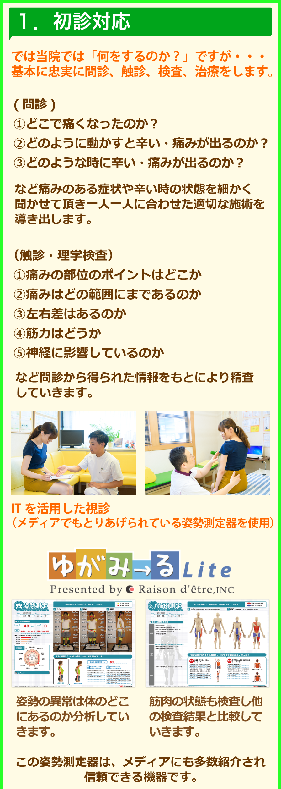 問診、触診、IT機器を活用した姿勢測定などの検査を行い、改善のためのポイントを見つけ出し治療計画を立てていきます。