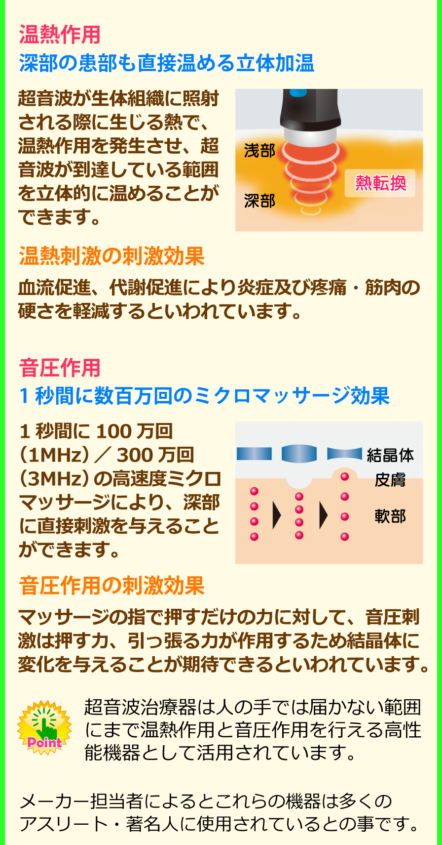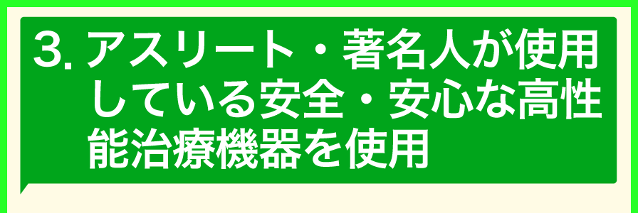 - アスリート・著名人が使用している安全・安心な高性能治療機器を使用していること